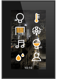 Vertikální kapacitní dotyková obrazovka, přes kterou lze řídit a monitorovat všechna nainstalovaná zařízení pomocí ikon (obrázků). Obrázek pozadí, ovládací prvky, texty jsou kompletně editovatelné a lze vytvořit až 6 různých motivů, které lze naprogramovat tak, aby se automaticky změnily. Tímto způsobem lze panel plně přizpůsobit podle místa, kde bude instalován.